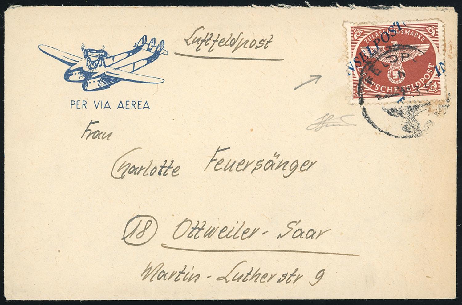 OCCUPAZIONE TEDESCA EGEO 1945 - Inselpost, soprastampa di Agram (5), soprastampa fortemente spostata, "a cavallo", e tratto tipografico dopo la "T", su busta dalla Feldpost "h", marzo 1945 per la Germania. Combinazione di varietà non catalogata dal Sassone. Molto rara. Ferrario.