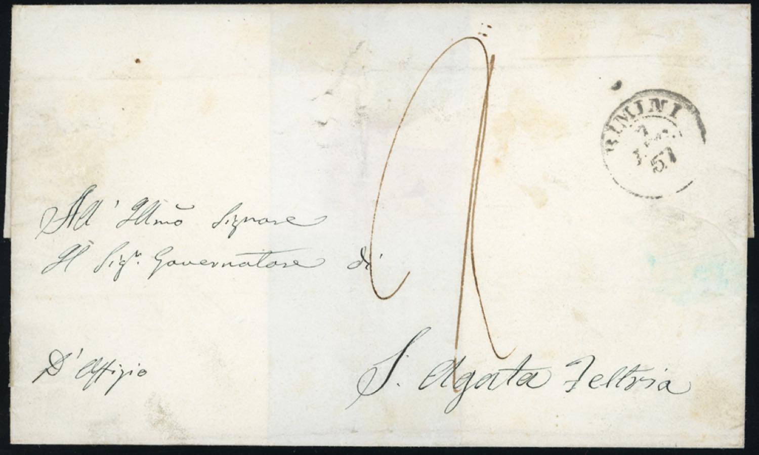 1857 - 1 baj verde grigiastro (2), due esemplari tagliati irregolarmente, al verso di sovracoperta di lettera in porto assegnato da San Marino, doppio cerchio di Rimini 7/7/1857 sul fronte, a S.Agata Feltria, tassata 2 baj. Le lettere da S.Marino con la prima emissione di Pontificio sono estremamente rare, solo una quindicina di documenti conosciuti. Colla, cert. Sorani.