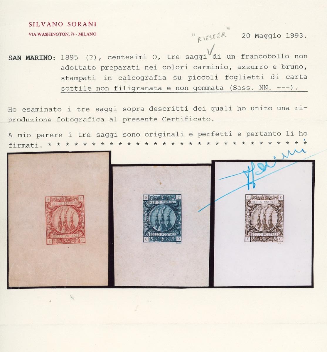 1865 - Saggi Reister non adottati, tre esemplari rispettivamente in carminio, azzurro e bruno, stampati in calcografia su piccoli foglietti di carta sottile non filigranata, non dentellati e senza gomma. Splendidi e molto rari! Cert. Sorani.