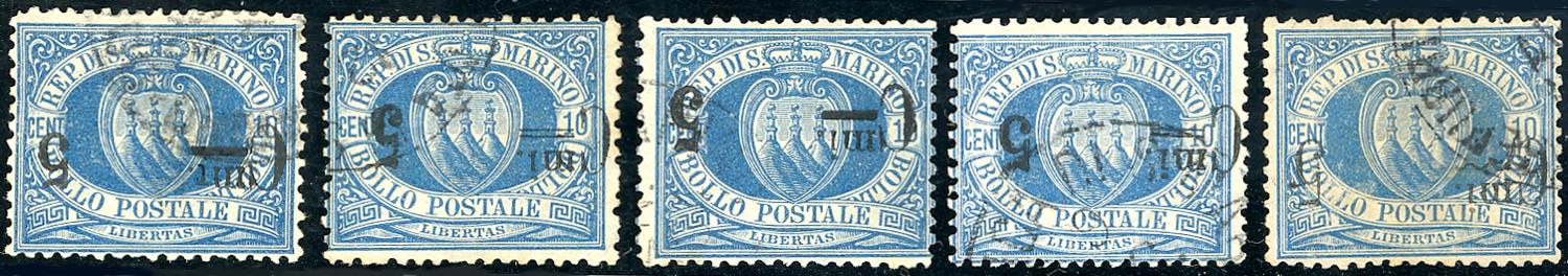 1892 - 5 cent. su 10 cent., cinque esemplari, tutti con soprastampa capovolta (8a), e ulteriori varietà nei caratteri della soprastampa, usati, perfetti.