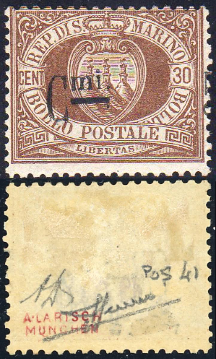 1892 - 5 cent. su 30 cent., soprastampa fortemente spostata a destra (9h), al punto da rendere la cifra "5" quasi completamente mancante, ... Read more