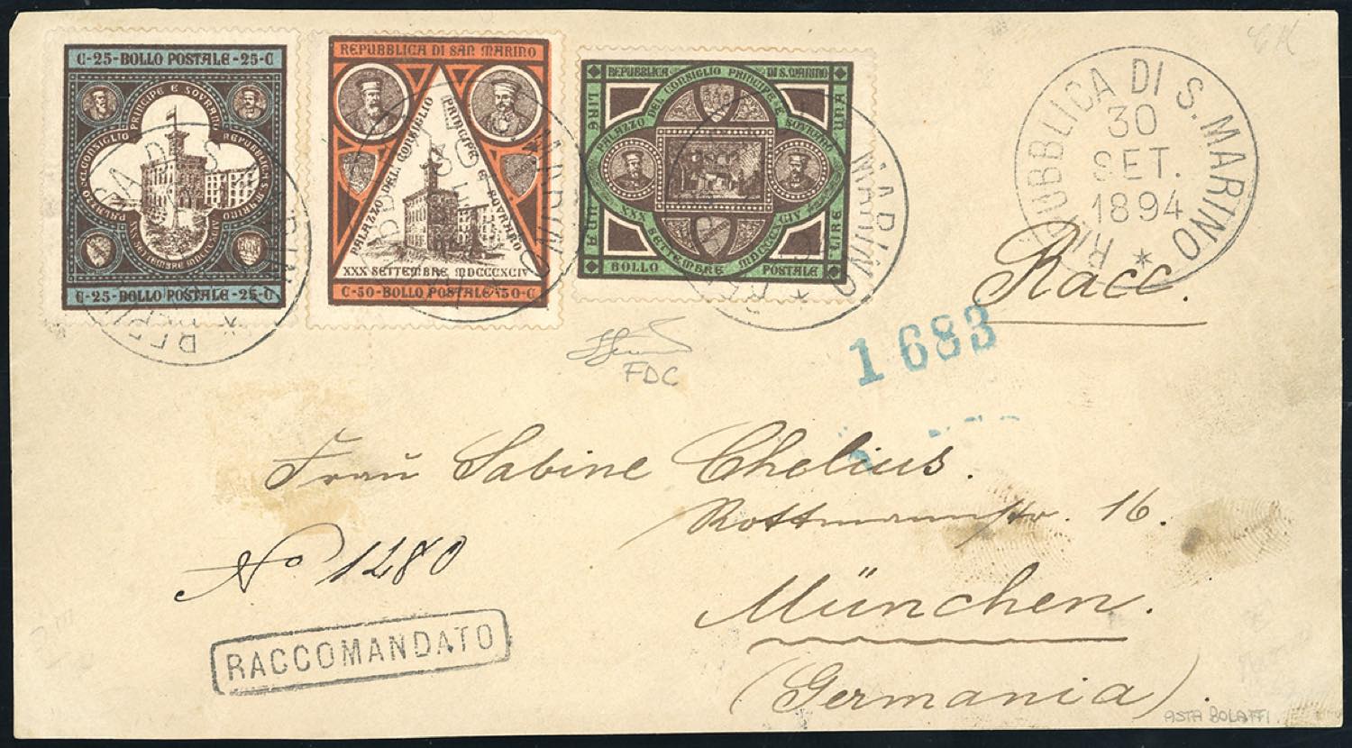 1894 - Palazzo del Governo, serie completa (23/25), perfetti, su frontespizio di raccomandata da San Marino 30 settembre 1894 a Munchen, usati nel primo giorno d'emissione. Insieme estremamente raro. Ferrario.