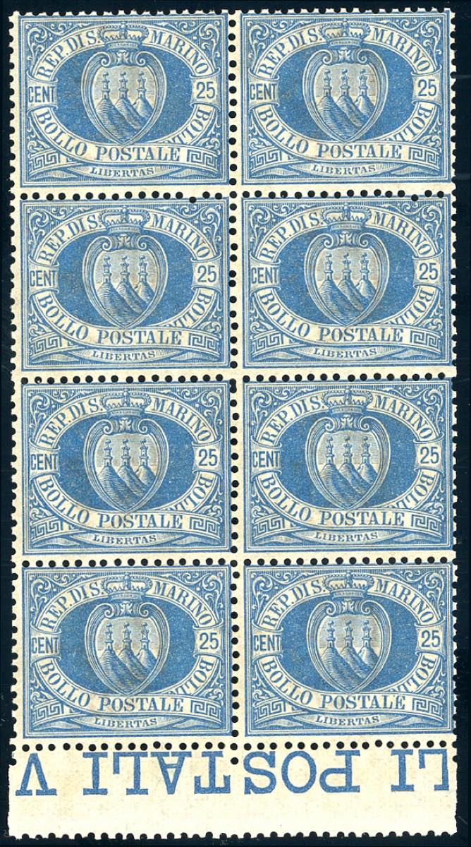 1894 - 25 cent. Stemma (30), blocco di otto, discreta centratura, bordo di foglio, gomma integra, perfetto.
