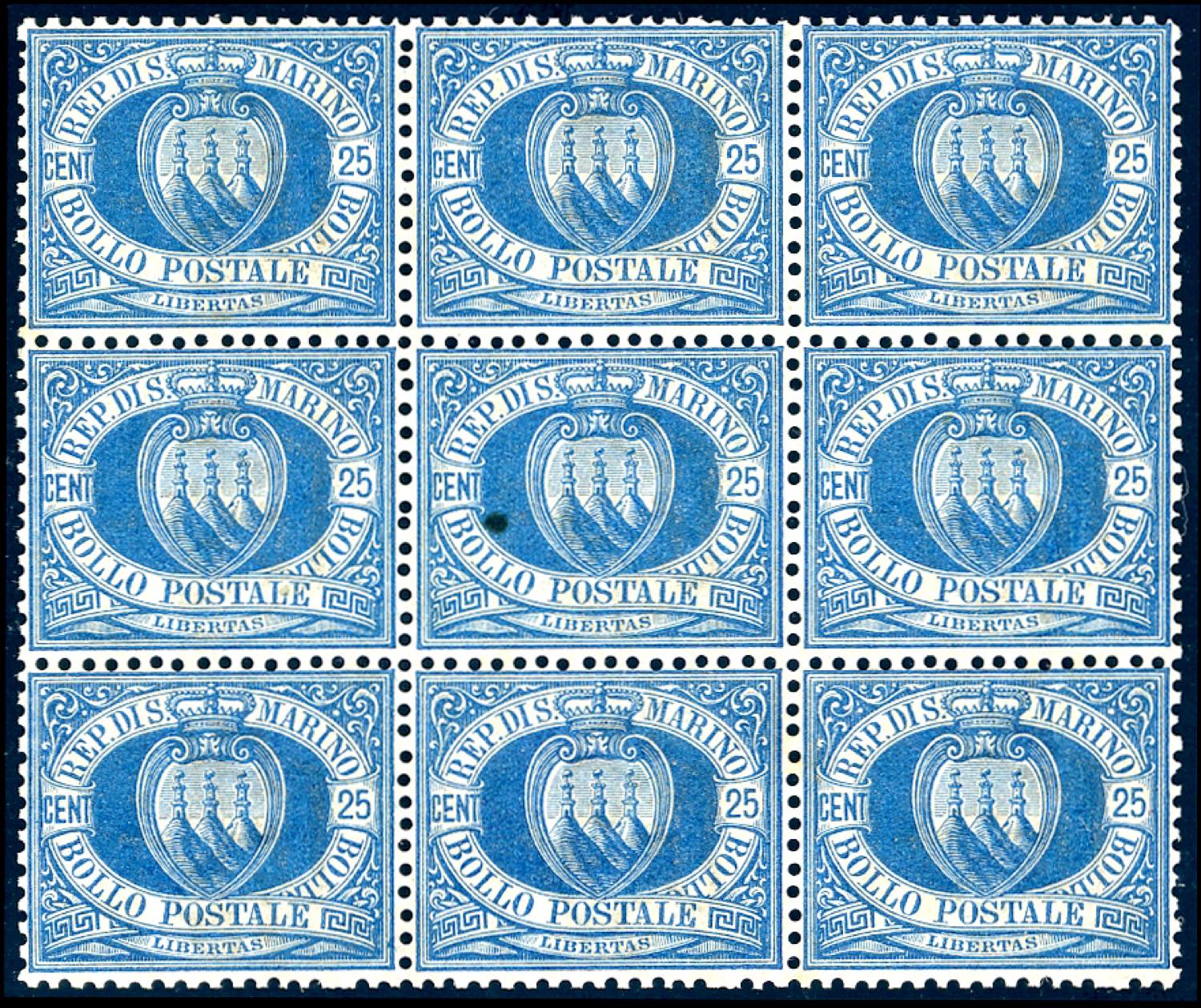 1899 - 25 cent, azzurro Stemma (30), ottima centratura, blocco di nove, gomma originale integra, perfetto. Ottima qualità. Ferrario.
