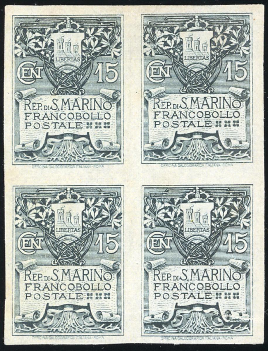 1907 - 15 cent. Stemma (48), prova di stampa, non dentellato, blocco di quattro, senza gomma come sempre, perfetto. Ferrario.