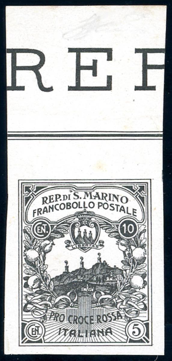 1916 - 10 + 5 cent. Croce Rossa, prova di stampa in nero, non dentellata (CEI P50A, € 1.250+), bordo di foglio, senza gomma come sempre, ... Read more