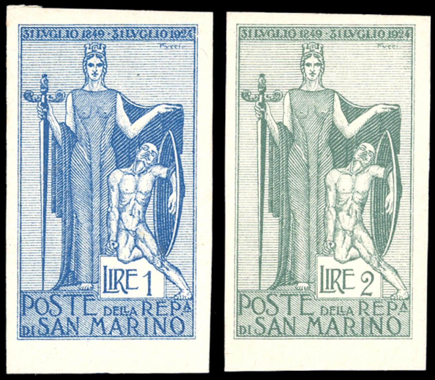 1924 - 1 lira e 2 lire Garibaldi (101,102), prove litografiche nei colori adottati su cartoncino, non dentellato, senza gomma, perfette. ... Read more