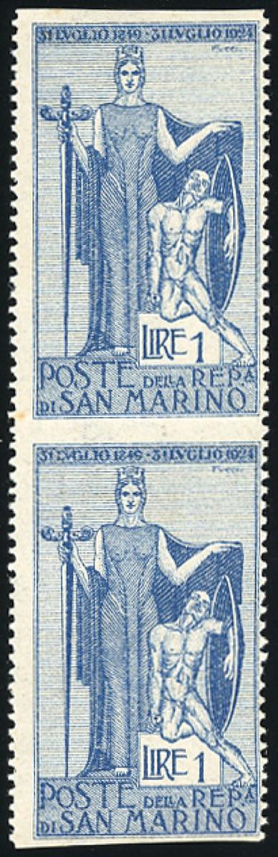 1924 - 1 lira Garibaldi, non dentellato orizzontalmente (101a), coppia verticale, gomma originale integra, perfetta. Ferrario