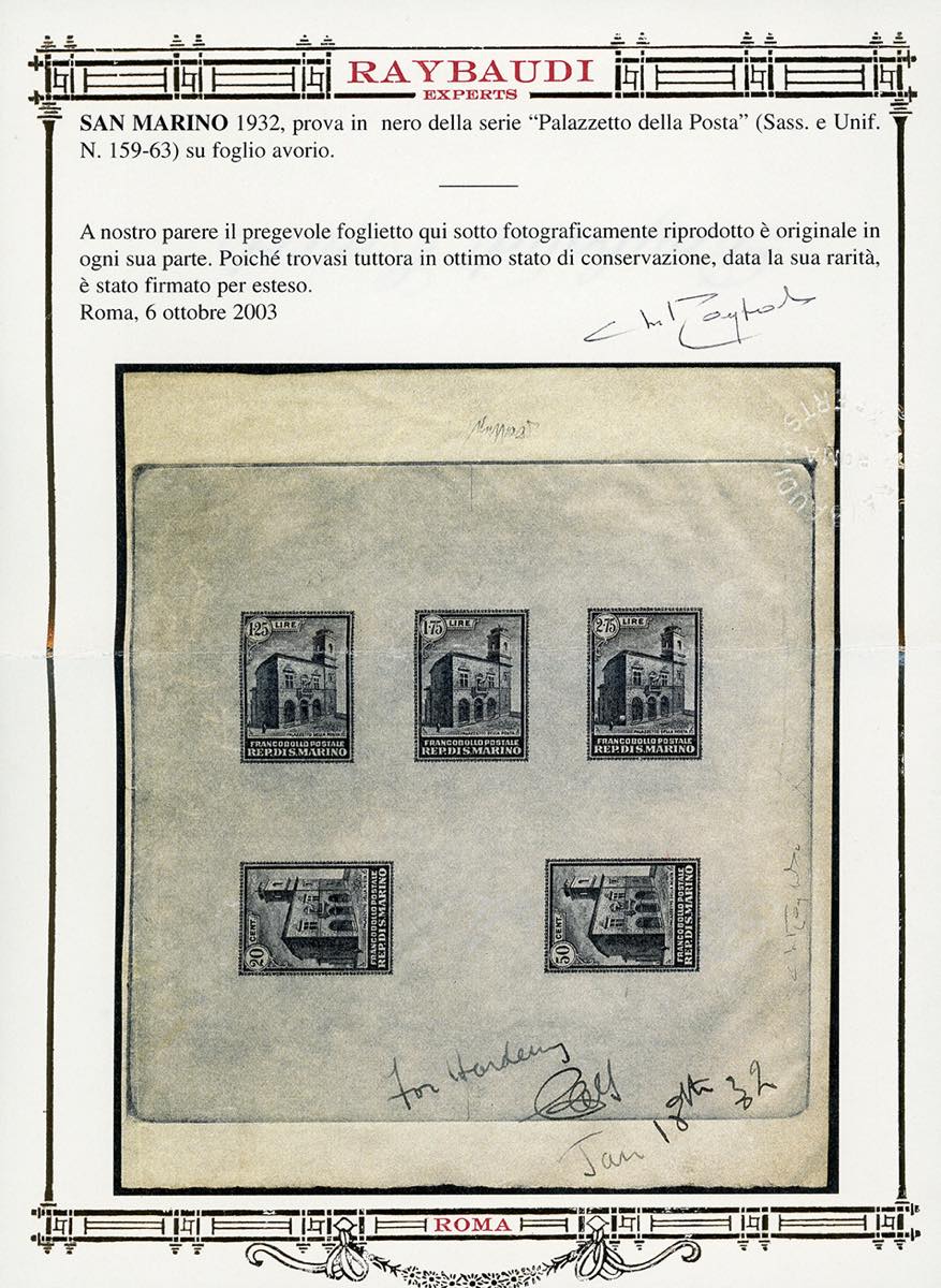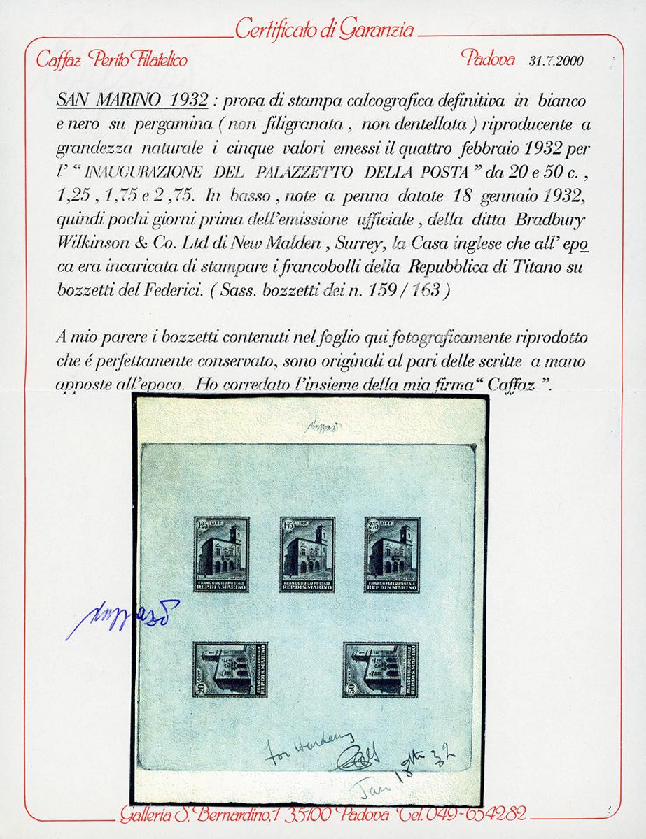 1932 - Palazzetto della Posta, serie completa (159/163), prova di stampa calcografica definitiva in nero su carta pergamino, cm 13,5x15,5, senza gomma, perfetta. In basso sono presenti le note a penna datate 18/1/1932 della stamperia Bradbury Wilkinson & Co., incaricata di stampare i francobolli. INSIEME UNICO e di grande fascino. Dettagliato cert. Caffaz e cert. Oro Raybaudi.