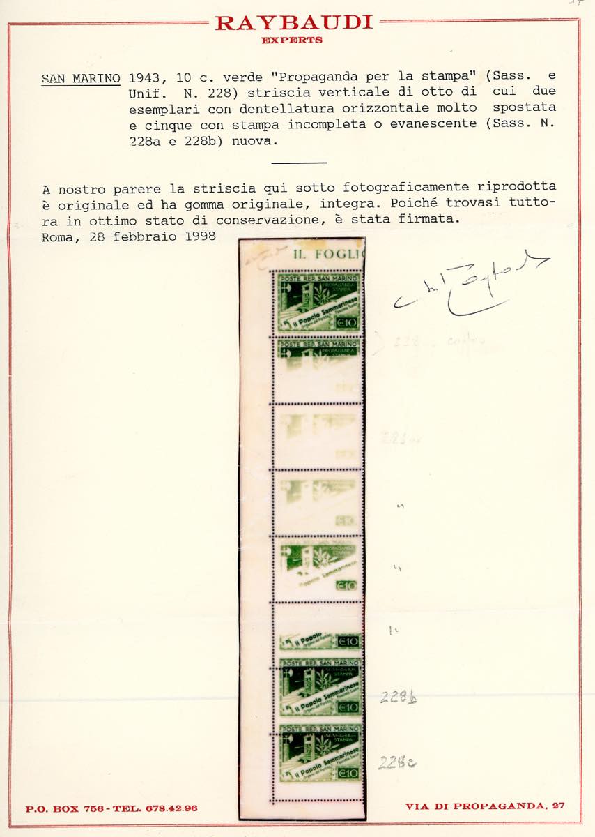 1943 - 10 cent. Propaganda per la stampa, striscia verticale di otto, quattro esemplari con stampa evanescente, tre con dentellatura ... Read more