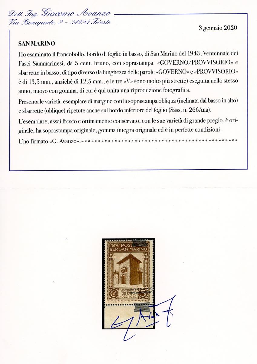 1943 - 5 cent. soprastampa "Governo Provvisorio" di tipo diverso obliqua, sbarrette ripetute anche sul bordo inferiore di foglio (266Ana), gomma originale integra, perfetto. Molto bello. Cert. Avanzo.