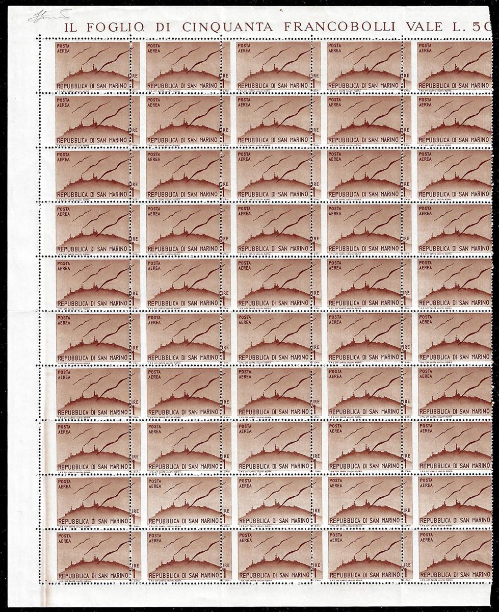 1946 - 1 lira Vedute, foglio completo di cinquanta esemplari, dentellatura verticale fortemente spostata a sinistra, i dieci esemplari ... Read more