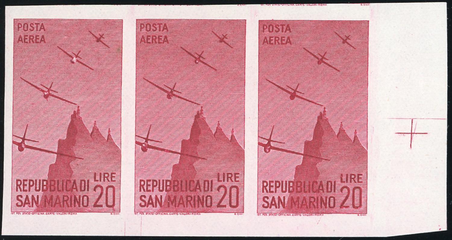 1946 - 20 lire Vedute, non dentellato (57b), striscia orizzontale di tre, angolo di foglio, gomma originale integra, perfetta. Bella. ... Read more