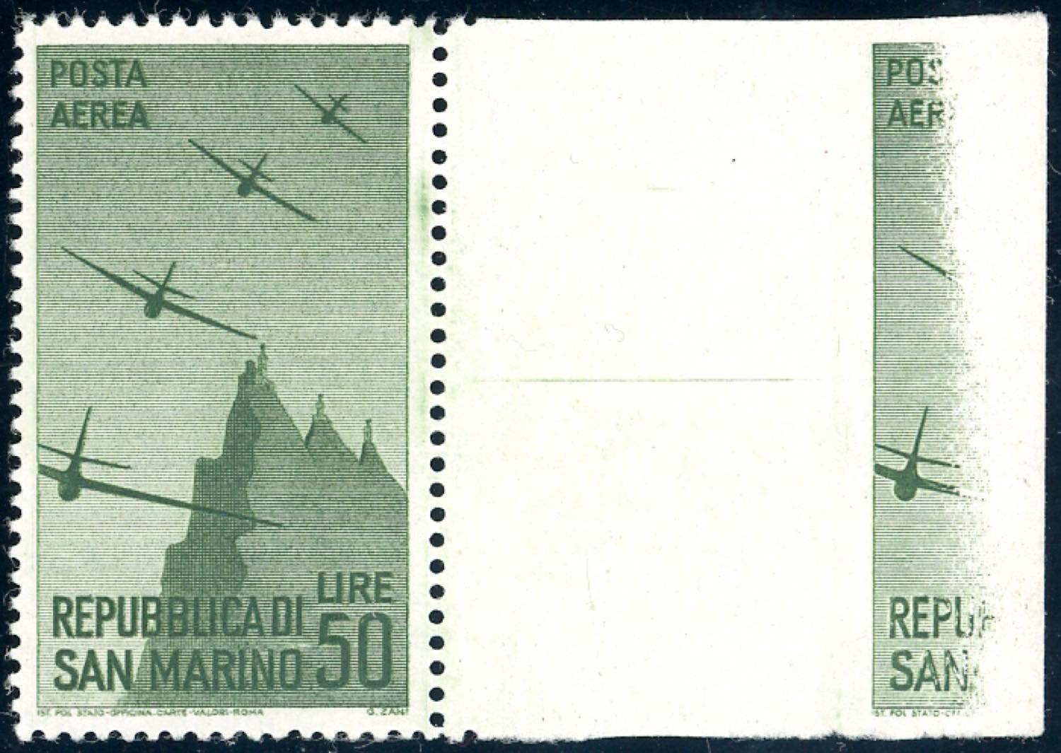 1946 - 50 lire Vedute, interspazio di gruppo laterale destro e parte del francobollo adiacente non dentellato (59aa), gomma originale ... Read more