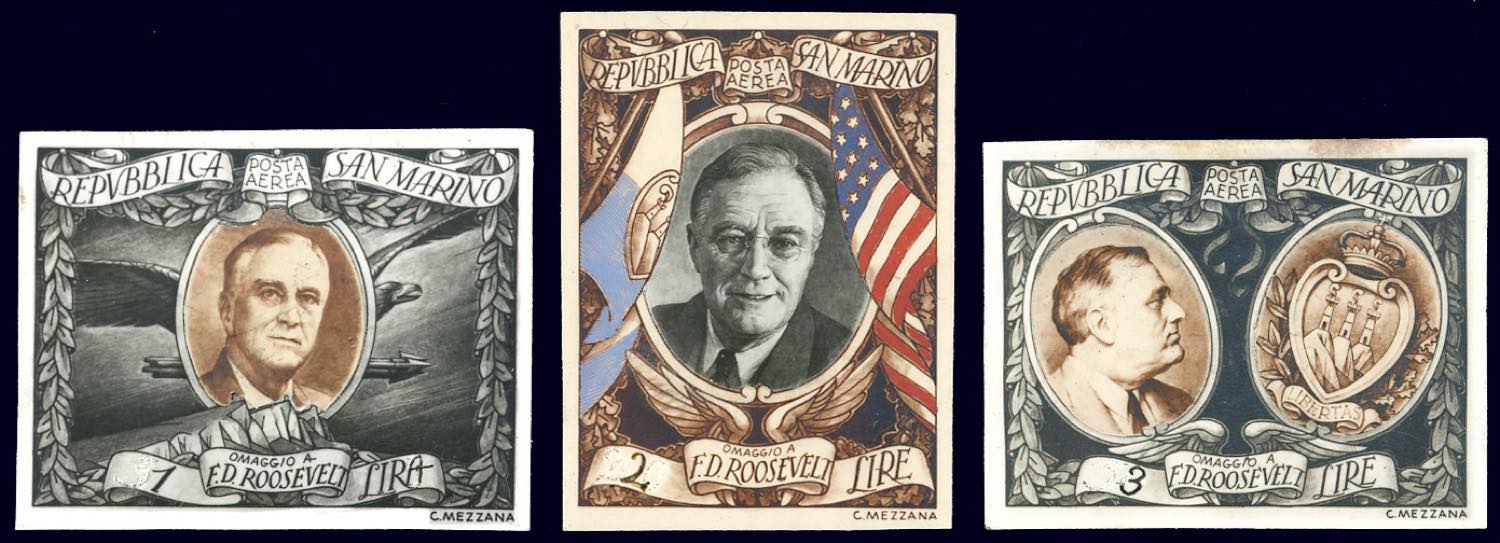 1947 - 1 lira, 2 lire, 3 lire Roosvelt (61/62), saggi fotografici di Corrado Mezzana con successiva applicazione degli ovali con le effigi. Il valore nominale delle prove risulta abraso e modificato all'epoca; il saggio da 2 lire è stato parzialmente colorato a tempera e non corrisponde al francobollo successivamente adottato; il 3 lire, valore che non è mai stato emesso per questa serie, è stato invece ottenuto dal saggio fotografico del 50 lire. Insieme unico e di grande fascino.