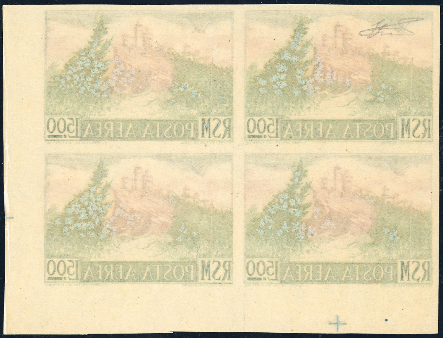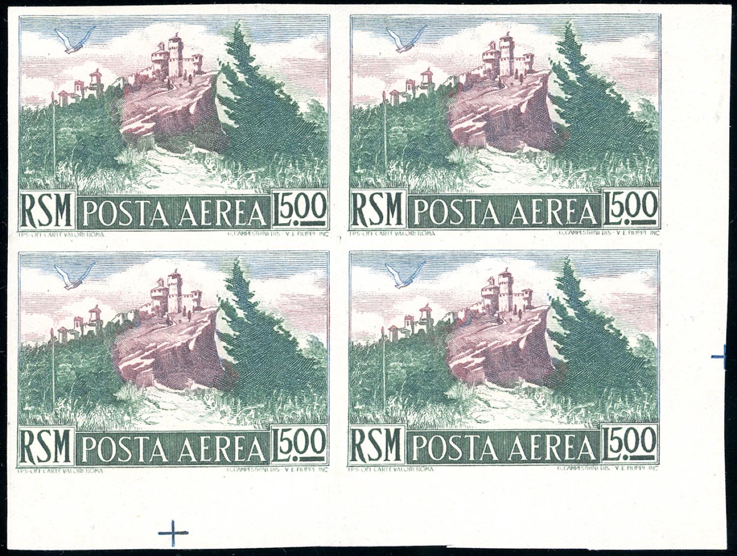 1950 - 500 lire Vedute, non dentellato (91b), blocco di quattro, angolo di foglio, gomma originale integra, perfetto. Bello e raro. Cert. ... Read more