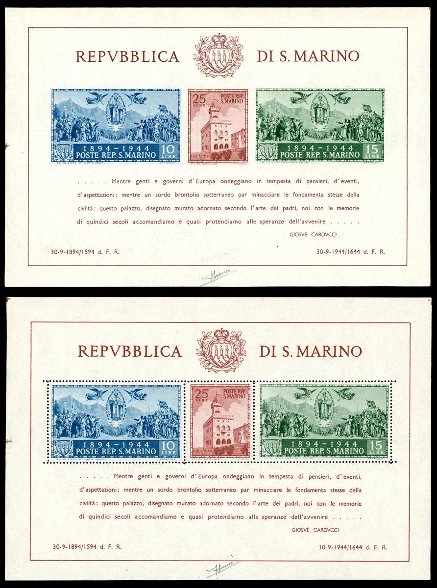 1945 - Palazzo del Governo, foglietto dentellato e non dentellato (6/7), gomma originale integra, perfetti. Sorani, Ferrario.