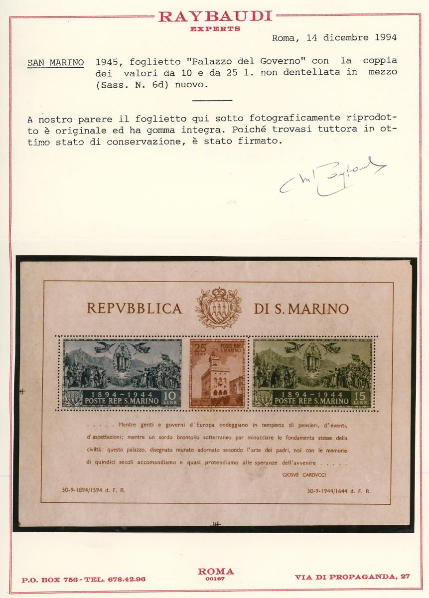 1945 - Palazzo del Governo, foglietto, coppia di valori da 10 e 25 lire non dentellata al centro (6d), gomma originale integra, perfetto. Raro! Cert. Raybaudi.