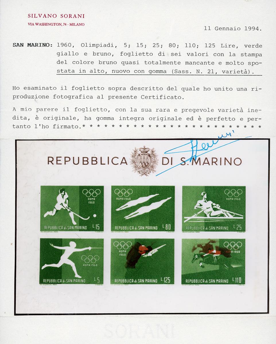 1960 - Olimpiadi di Roma, foglietto, stampa del bruno mancante in quattro valori e fortemente spostata in alto negli ultimi due (21), gomma originale integra, perfetto. Bella e rara varietà, non catalogata. Cert. Sorani e Raybaudi.
