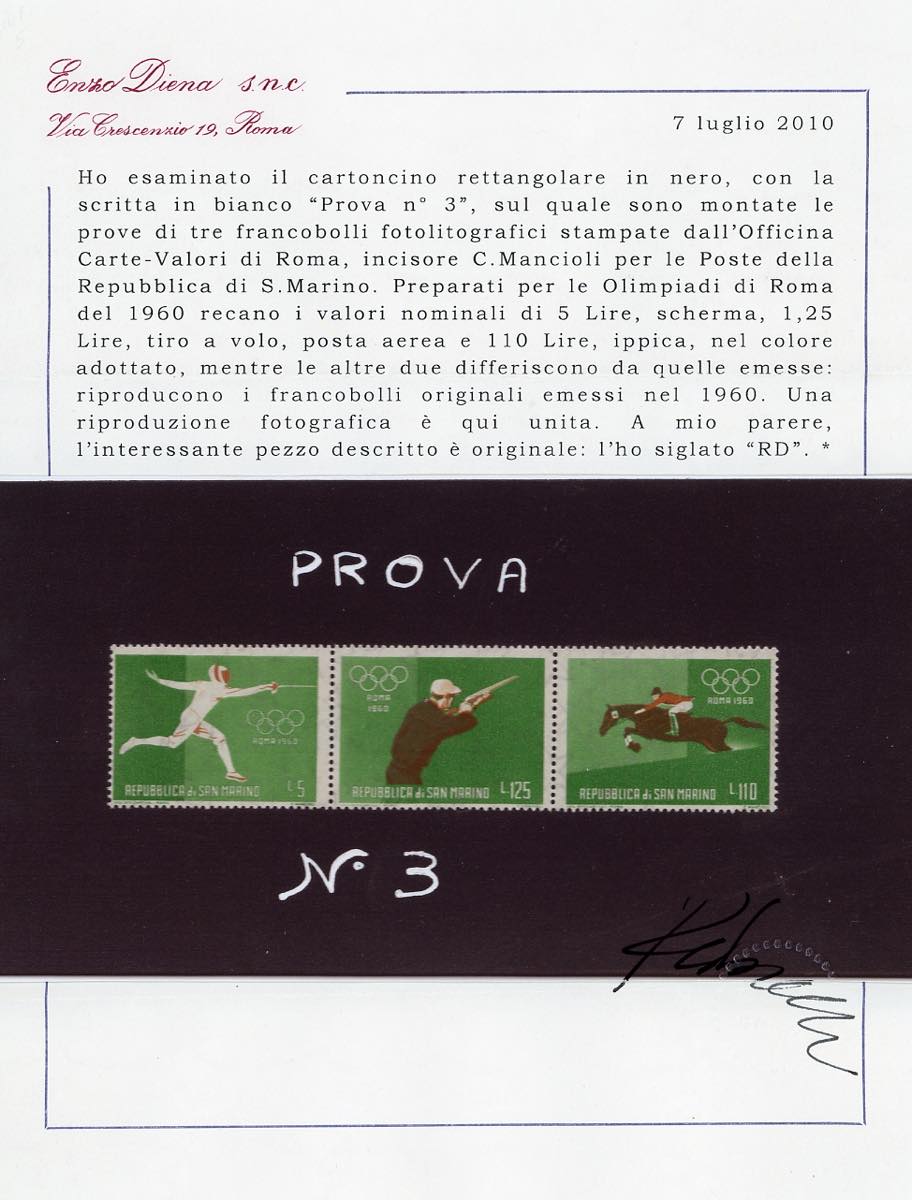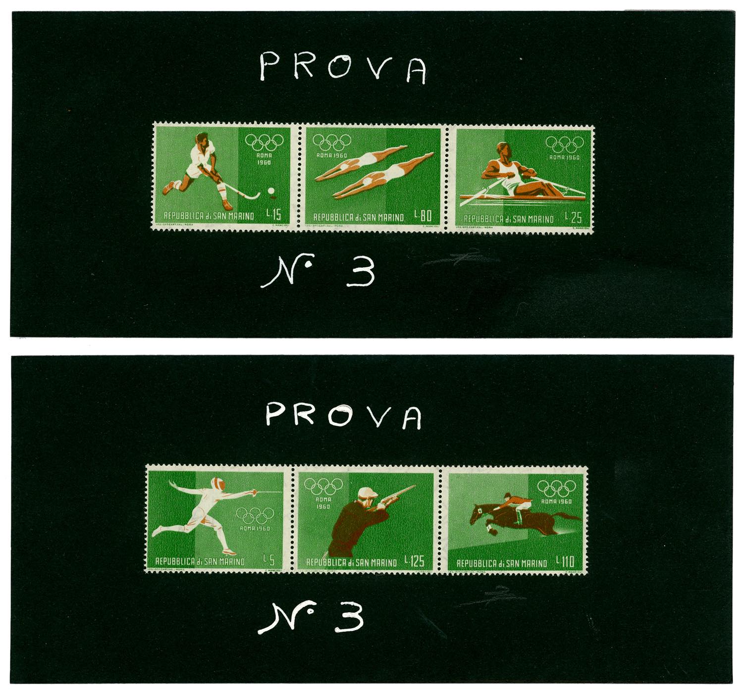 1960 - Giochi Olimpici di Roma, foglietto (21), due cartoncini neri, cm 19,5x9, con dicitura manoscritta "Prova n. 3", il primo con i ... Read more