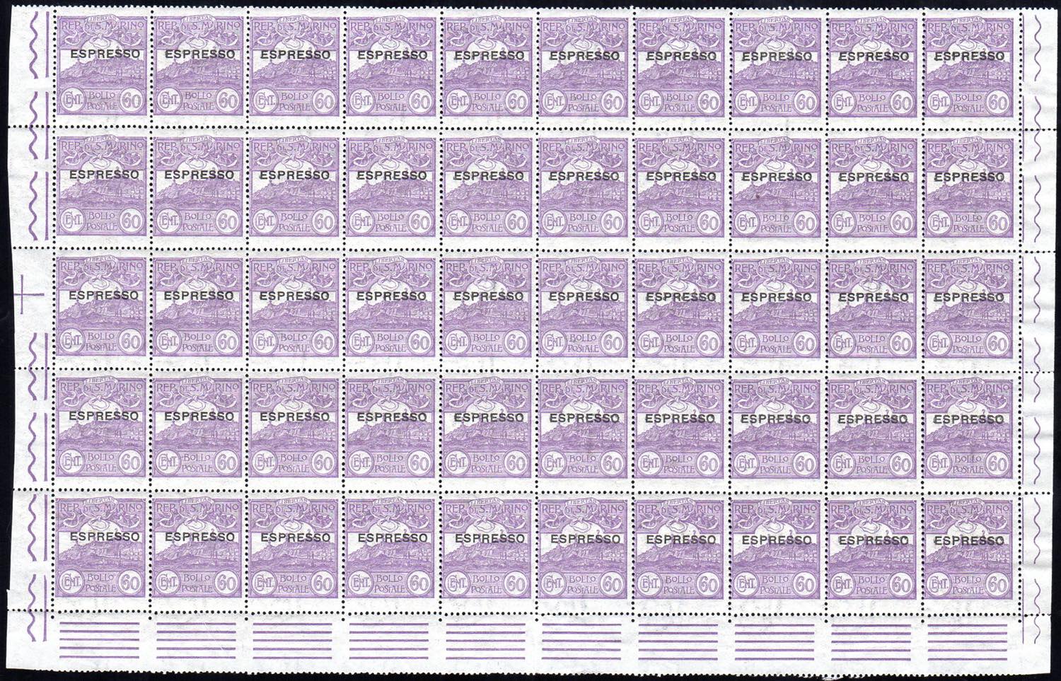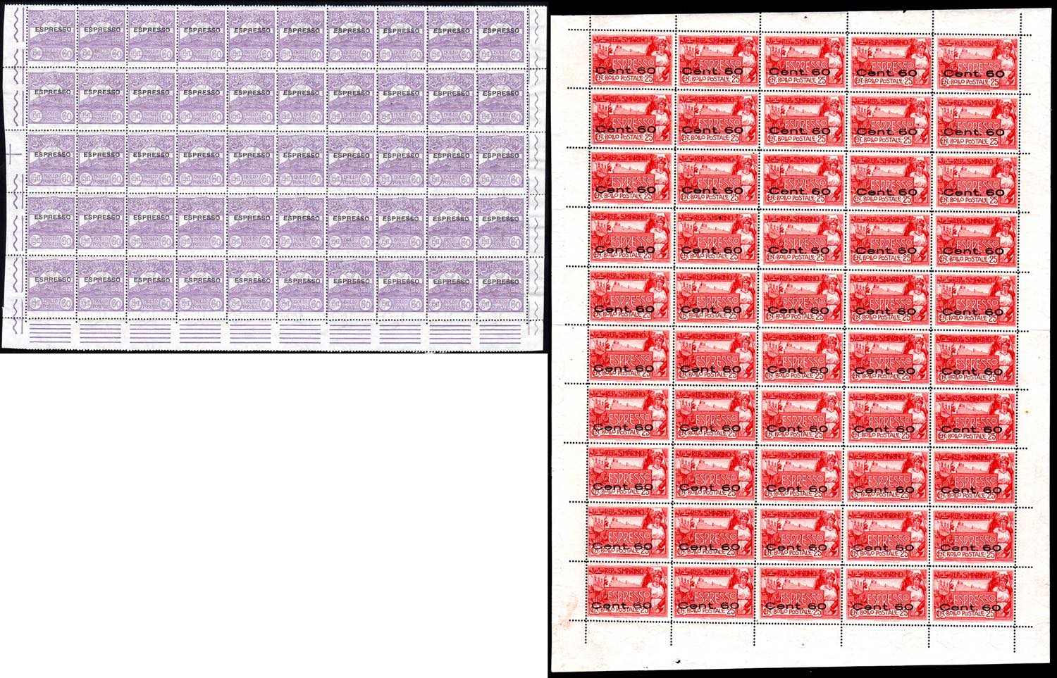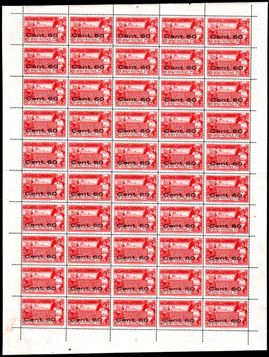 1923 - 60 cent. soprastampato "espresso" e 60 cent. su 25 cent. (2,3), fogli completi di 50 esemplari, gomma originale integra, perfetti e ... Read more