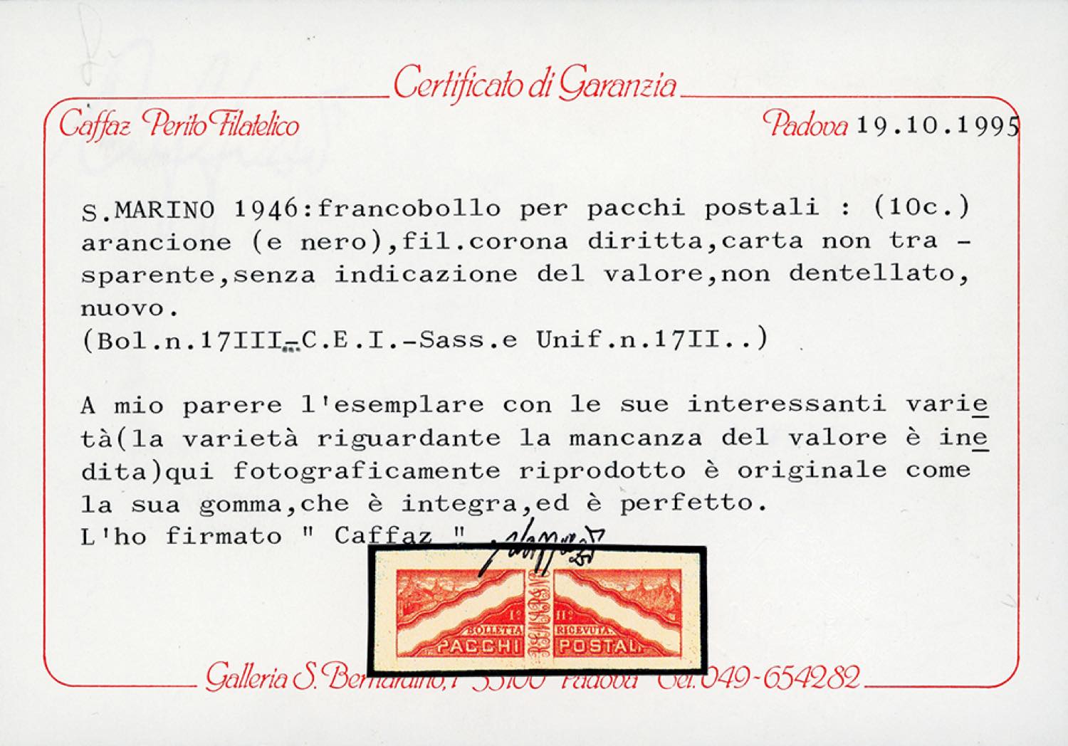 1946 - 10 cent. carta non trasparente, filigrana corona dritta, senza le diciture del valore in entrambe le sezioni (17/IIa), non dentellato, gomma originale integra, perfetto. Varietà molto rara, non catalogato non dentellato. Cert. Caffaz.
