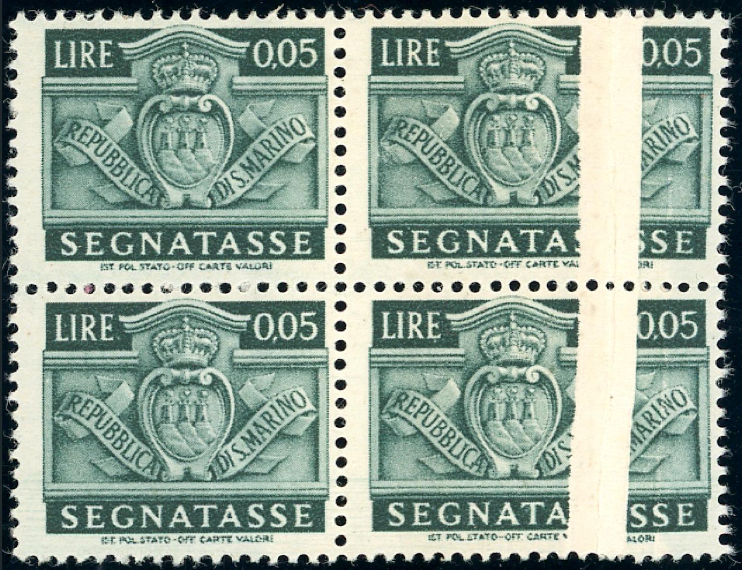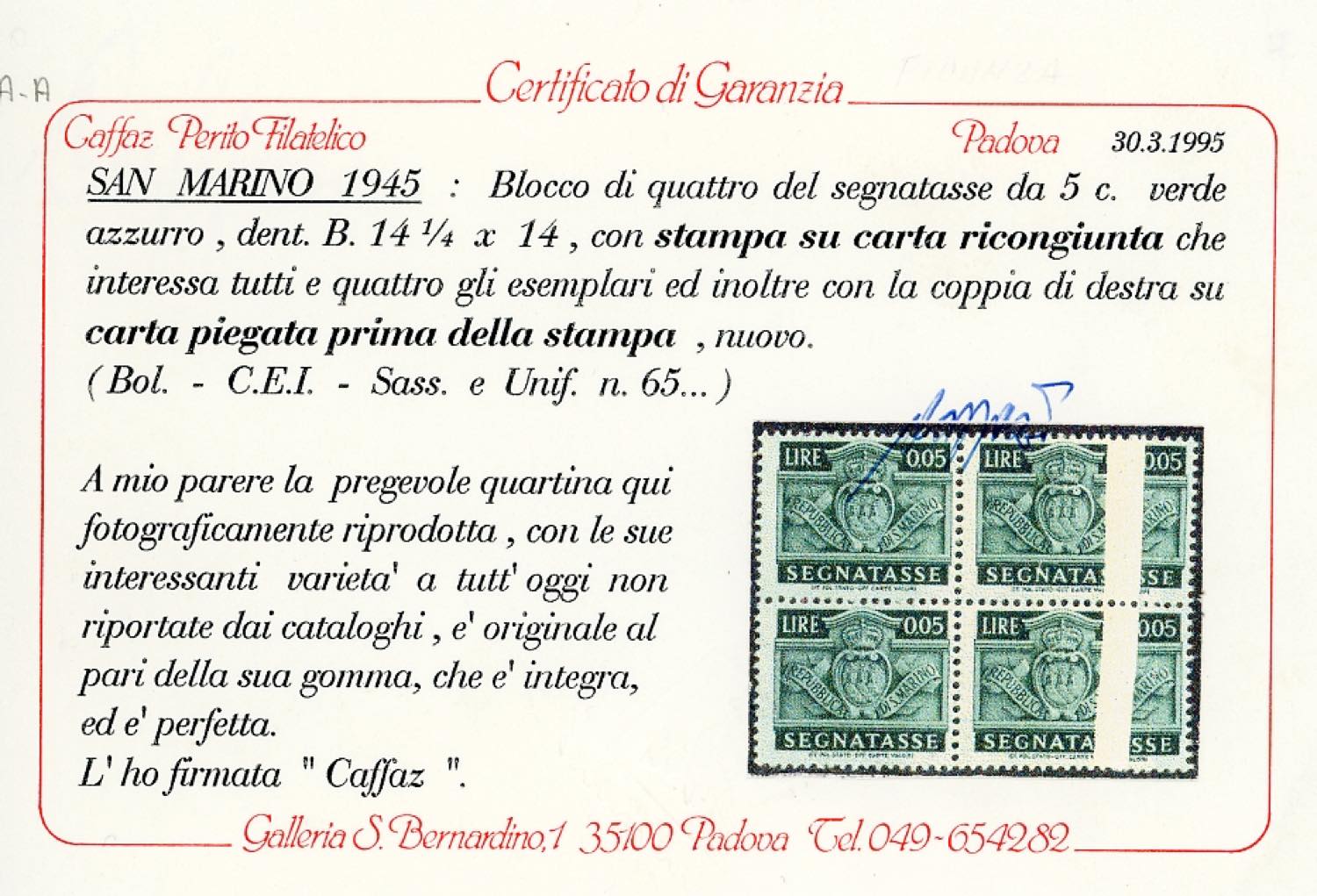 1945 - 5 cent. Stemma, blocco di quattro, tutti gli esemplari stampati su carta ricongiunta (65d), i due di destra con evidente pli ... Read more