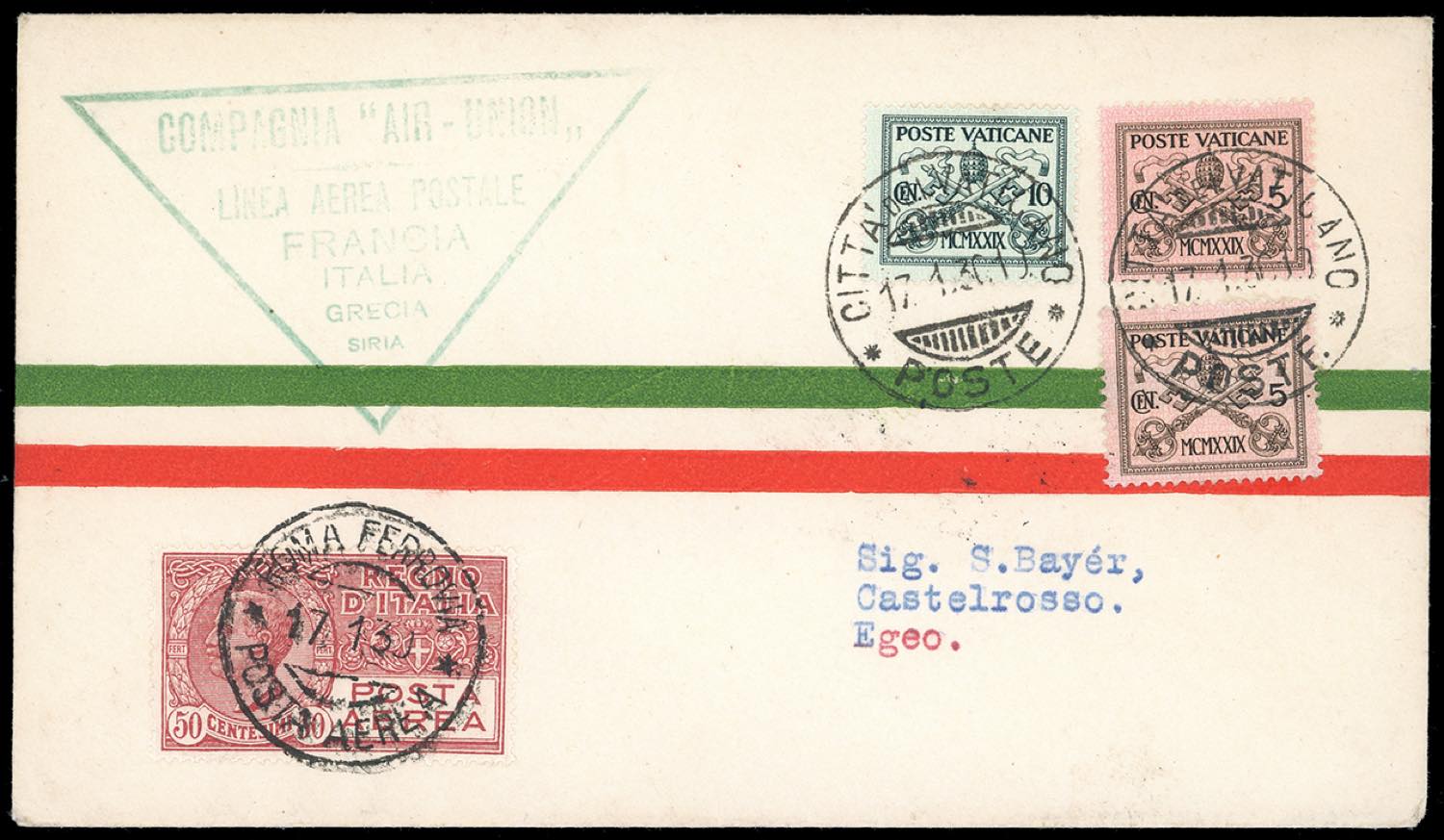 1930 - 5 cent., due esemplari, 10 cent. Conciliazione (1/2), in affrancatura mista con 50 cent. Vittorio Emanuele III (Regno A2A), perfetti, su aerogramma da Città del Vaticano 17/1/1930 a Castelrosso, nell'Egeo, bollo d'arrivo. Una delle 98 buste di questo volo.