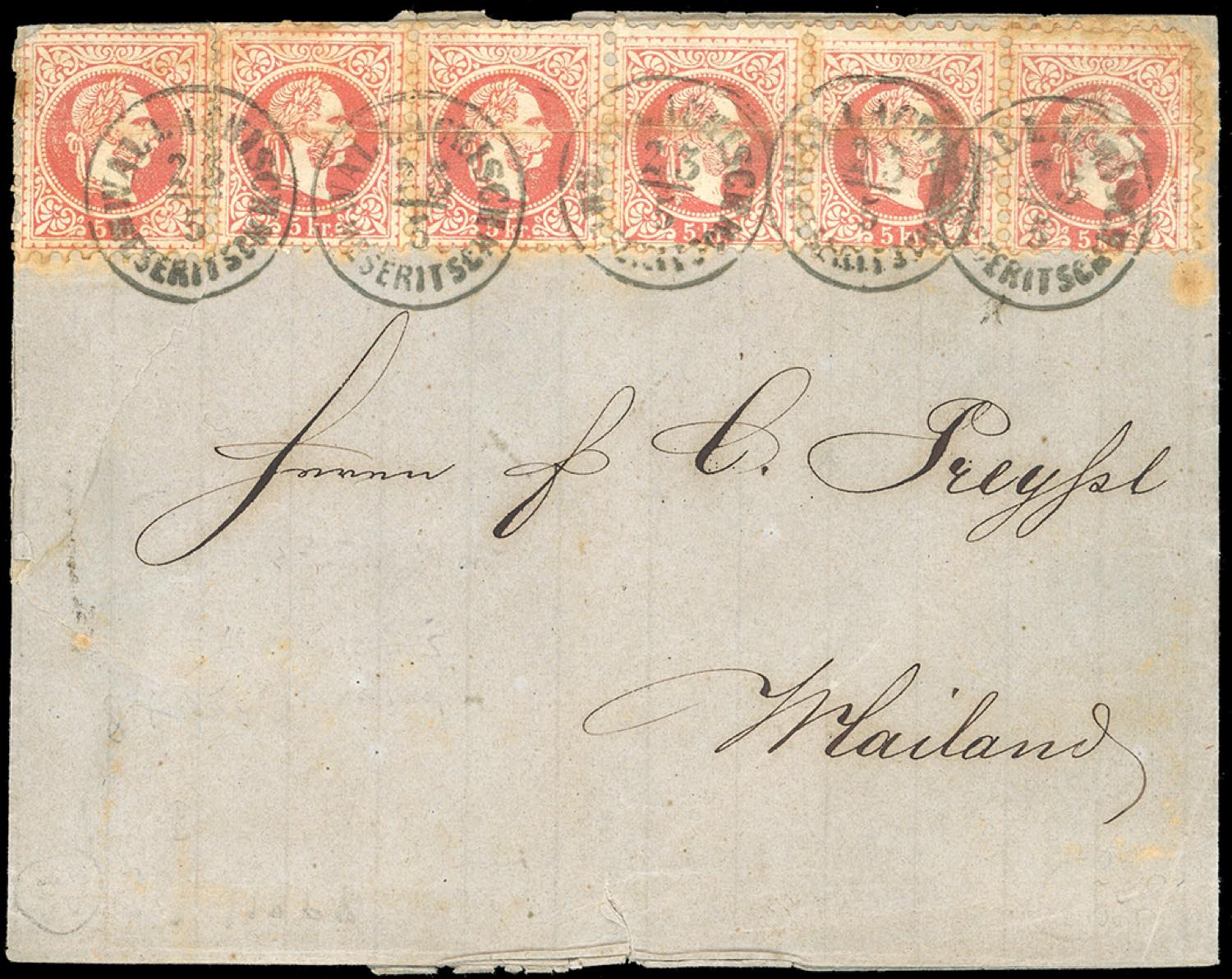 AUSTRIA 1868 - 5 kr. rosso (34), stampa grossolana, striscia di cinque e singolo, piega orizzontale, su lettera da Wallachisc 2375/1868 a ... Read more
