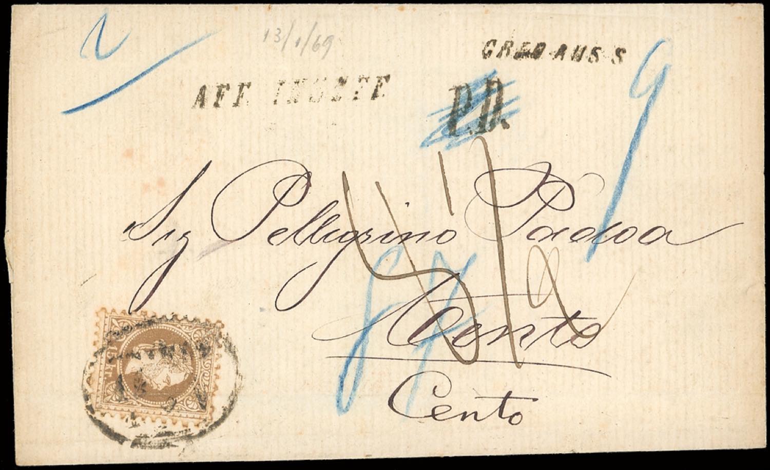 AUSTRIA 1869 - 15 kr. Francesco Giuseppe I (36), piega, su sovracoperta di lettera da Trieste a Cento 14/1/1869, vari segni di tassa. ... Read more