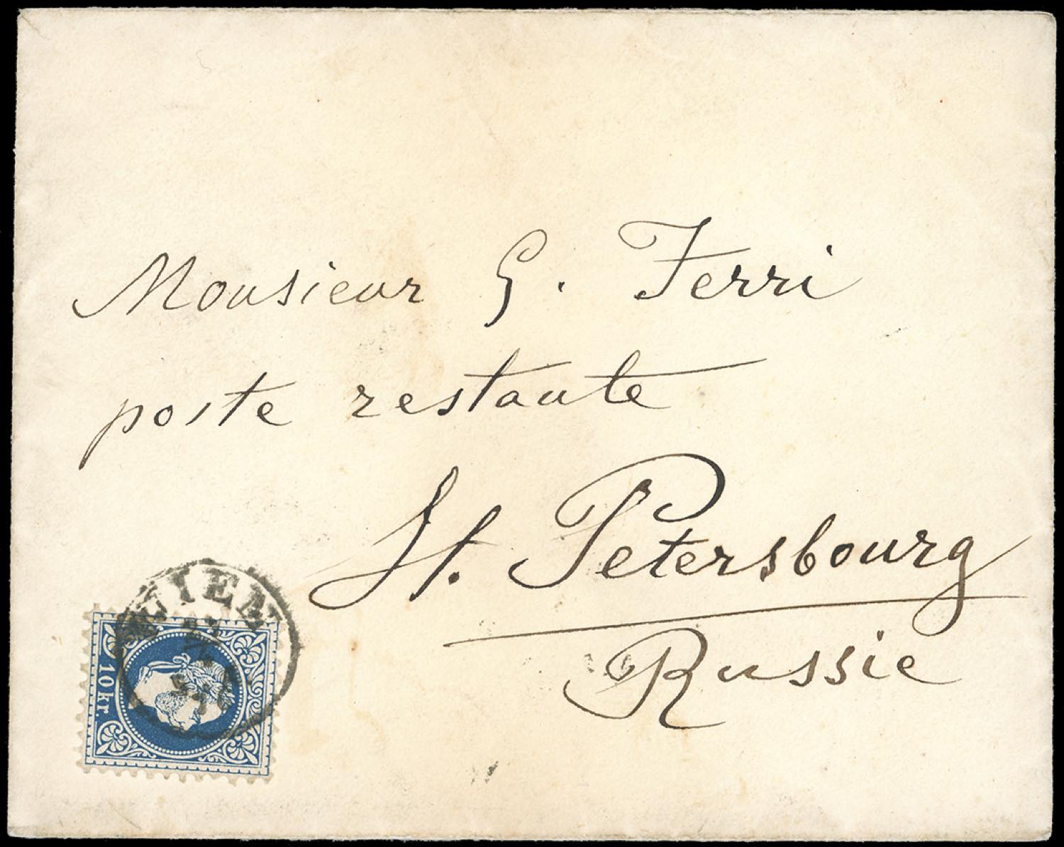AUSTRIA 1876 - 10 kr. azzurro, stampa fine (35/I), perfetto, su busta da Vienna 20/4/1876 a San Pietroburgo, bollo d'arrivo.