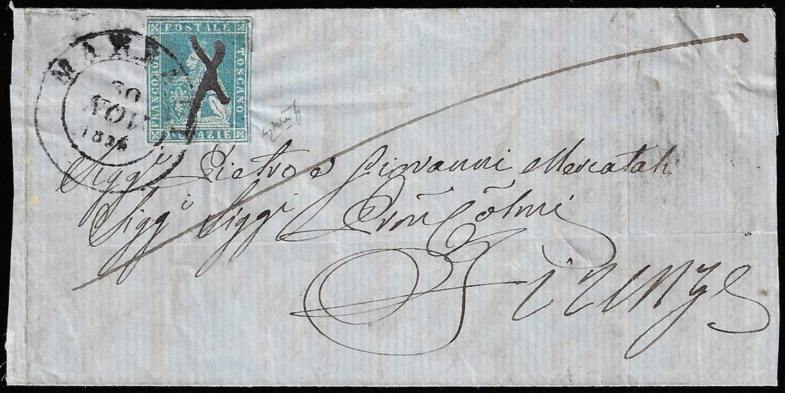MARRADI, doppio cerchio grande + penna coannullatori punti 10 (Sassone 2020) - 2 crazie (5c), perfetto, su sovracoperta di lettera, del 30/11/1854 per Firenze. Combinazione di annulli ad oggi inedita, unica! Cert. Avanzo.