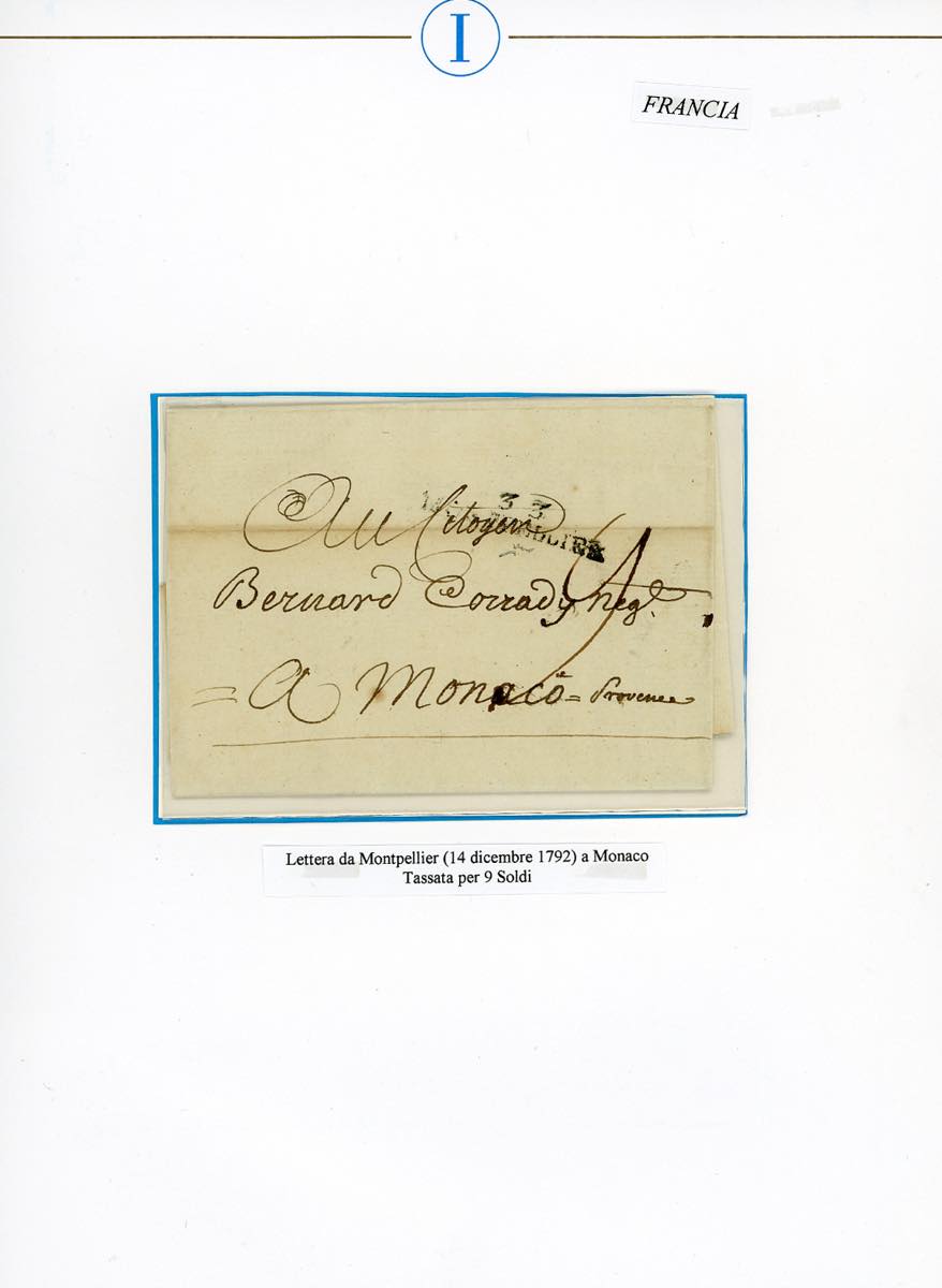 MONACO 1792 - Lettera prefilatelica da Montpellier 14/12/1792, bollo napoleonico dipartimentale, a Monaco, tassata 9. Pregevole incoming mail. Chiavarello. Ex coll. Imperato.