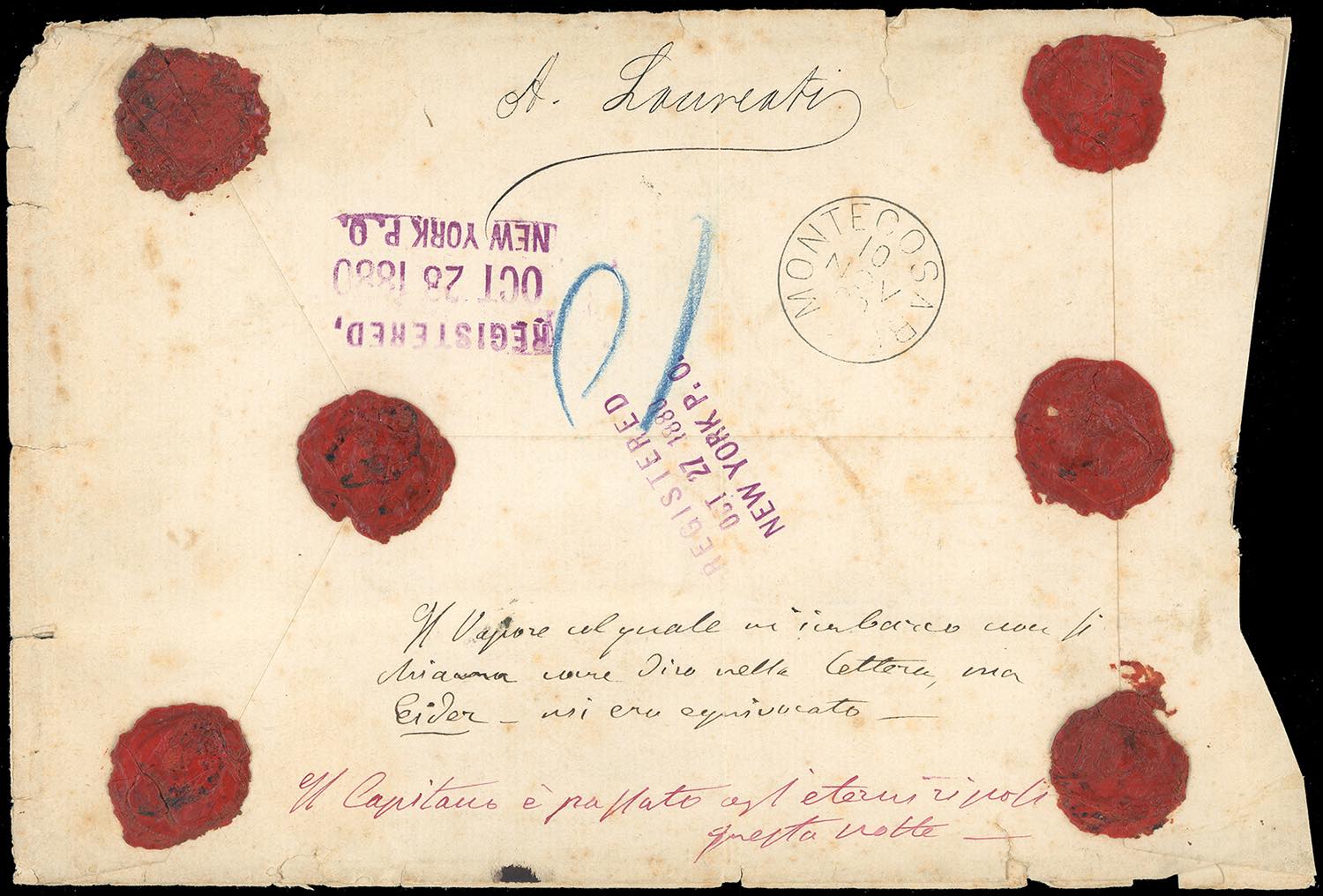 CUBA 1880 - 25 cent. e 50 cent., blocco di 6, Alfonso XII (Yv.37.38), difetti, su busta raccomandata da L'Avana ottobre 1880 a Montecorsaro, al verso i transiti di New York e i suggelli di ceralacca. Pregevole incoming mail, specie per un centro minore.