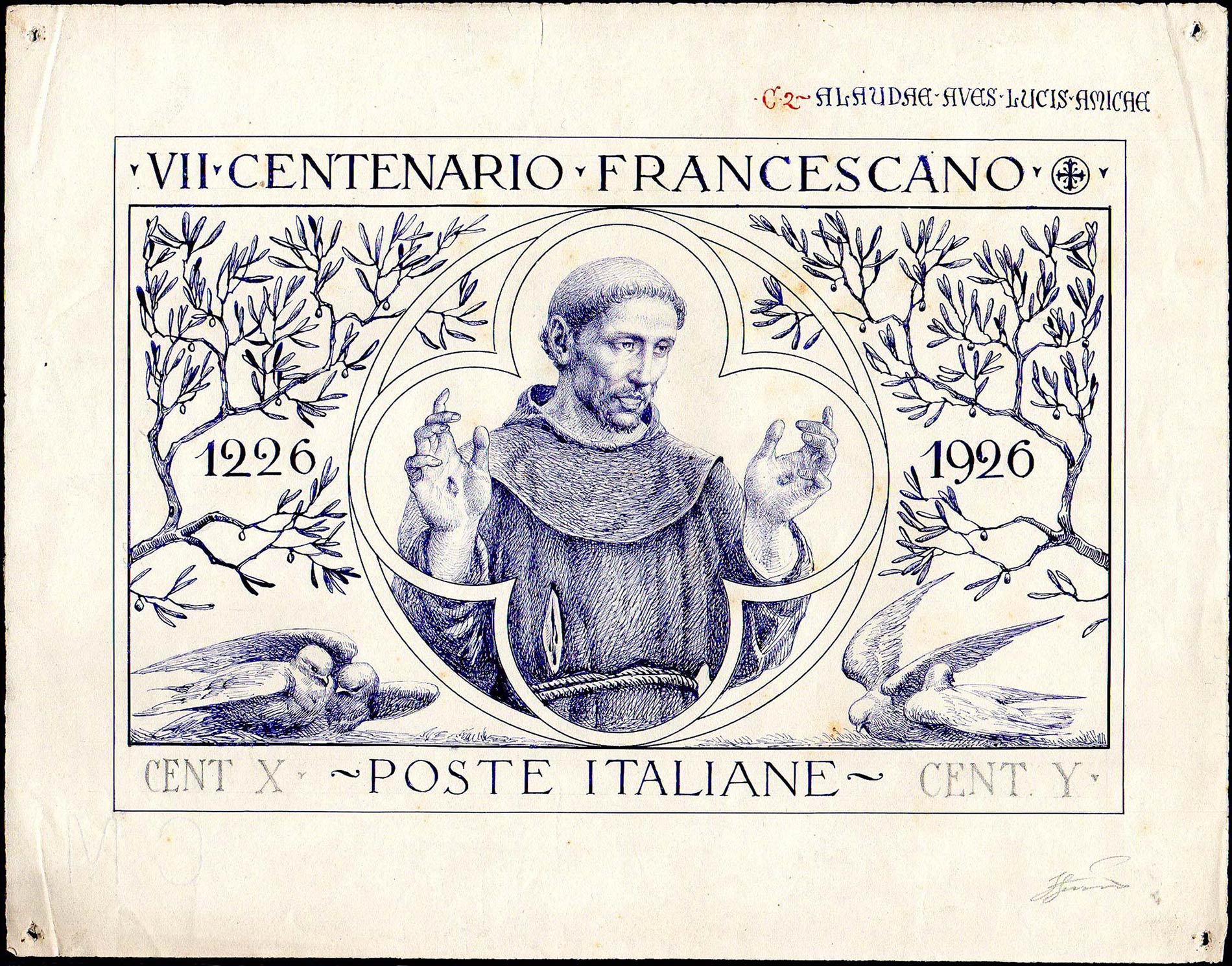 1926 - San Francesco, disegno a china e matita di autore ignoto, non adottato per l'emissione, su cartoncino cm. 37 x 28,5. Bello e interessante. Ferrario.