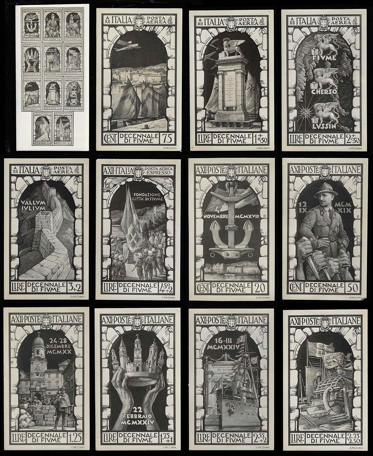 1934 - Decennale di Fiume, undici saggi fotografici dei soggetti adattati per la serie (350/356+A), ad opera di Corrado Mezzana, formato 10 x 16,5 cm., ed una fotografia dell'insieme. Rarissimo insieme, probabilmente unico.
