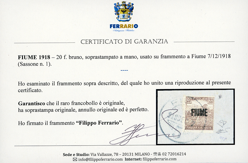 1918 - 20 f. soprastampato "FIUME" a mano (1), perfetto, usato su frammento a Fiume 7/12/1918. Molto bello. E.Diena, cert. Ferrario.