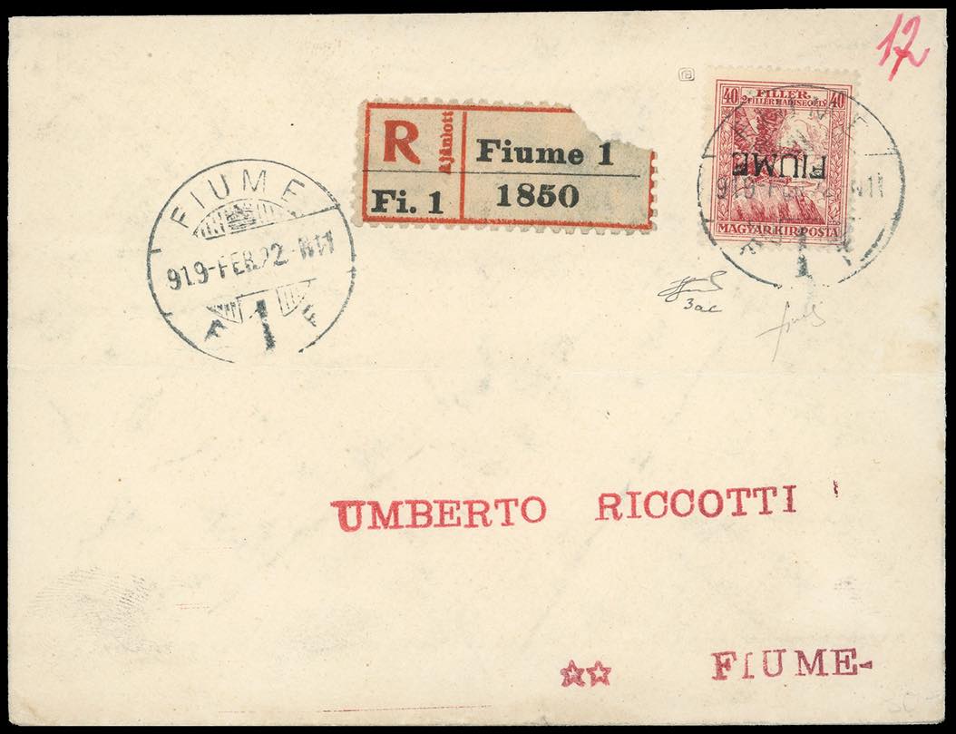 1918 - 40 + 2 f. Beneficenza, soprastampa a macchina capovolta (3ac), perfetto, usato su busta raccomandata da Fiume 22/2/1919 per città, ... Read more