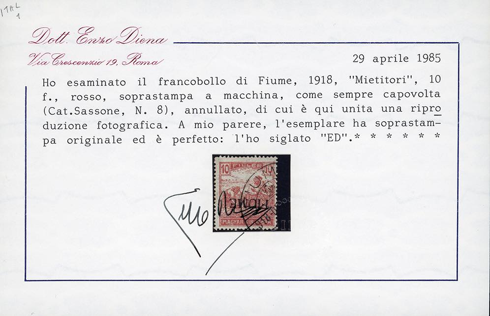 1918 - 10 f. rosso Mietitori, soprastampa a macchina, capovolta come sempre (8), usato, perfetto. Raro, tiratura 50 esemplari. Cert. ... Read more