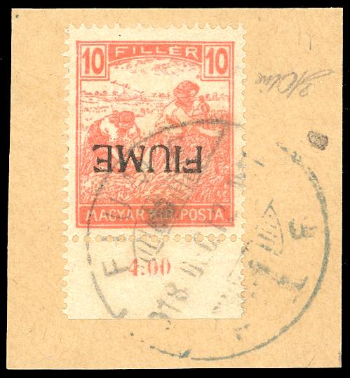1918 - 10 f. rosso Mietitori, soprastampa a macchina, capovolta come sempre (8), bordo di foglio, perfetto, usato su frammento. Raro, ... Read more