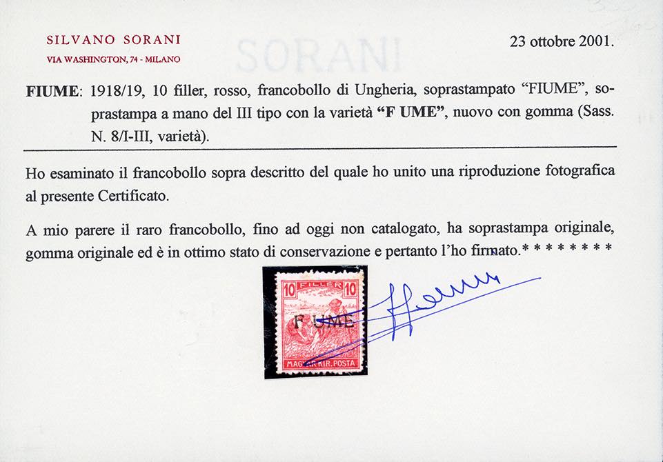 1918 - 10 f. rosso Mietitori, soprastampa a mano del III tipo, varietà "F UME" (8/IIIe), gomma originale, ottimo stato. Estremamente raro. Cert. Sorani.
