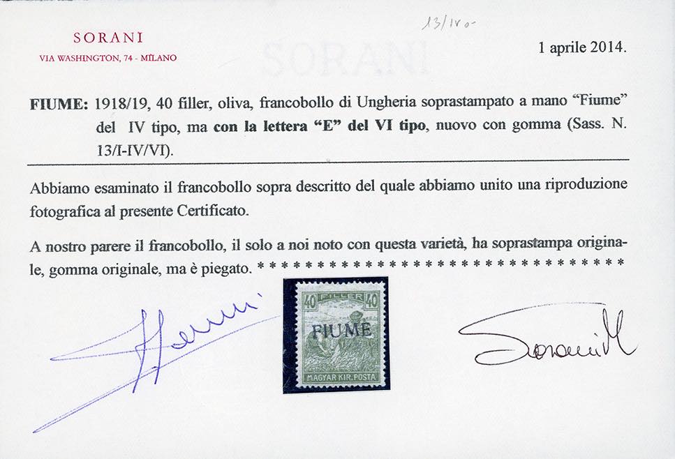 1918 - 40 f. Mietitori, soprastampa a mano del IV tipo, varietà lettera "E" di altro carattere (13/IVo), gomma originale, lieve piega orizzontale. Si tratta dell'UNICO ESEMPLARE NOTO di questa varietà, di cui si conosce un solo altro esemplare usato. Cert. Sorani.