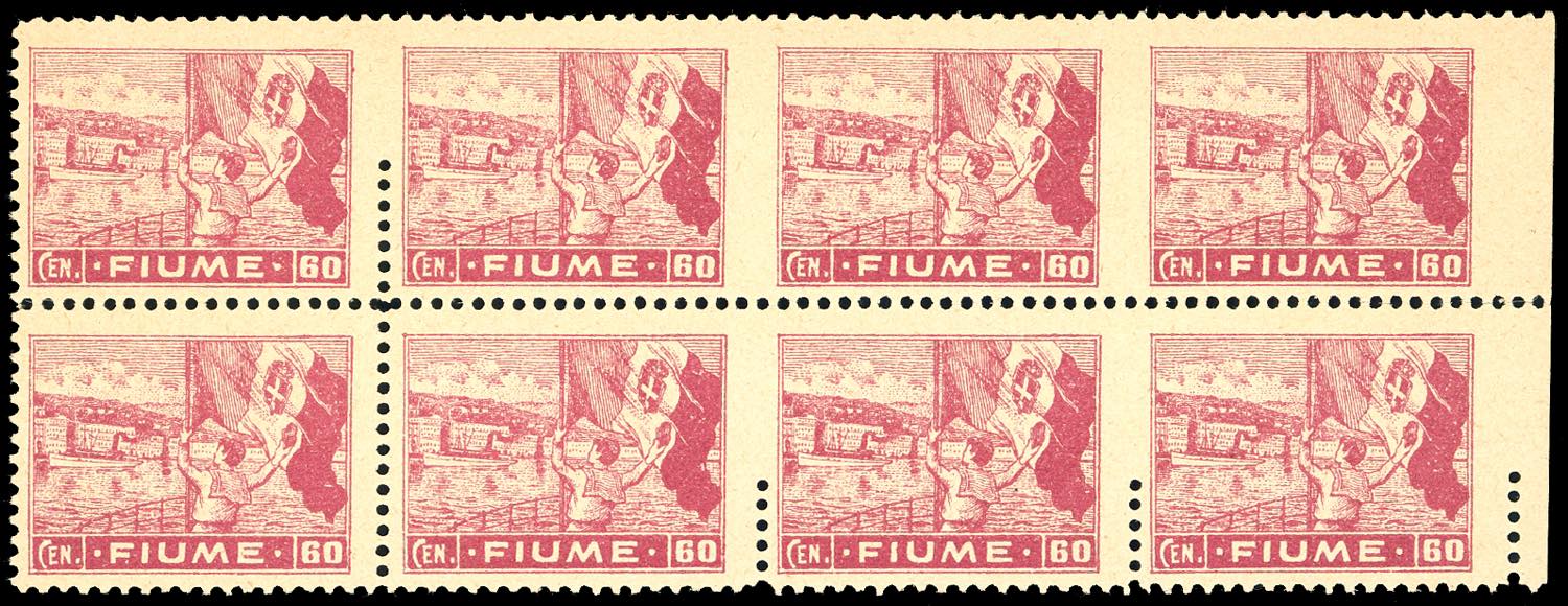 1919 - 60 cent. Allegorie e Vedute, carta A (A43), blocco di otto esemplari con interessanti varietà di dentellatura: due esemplari non ... Read more
