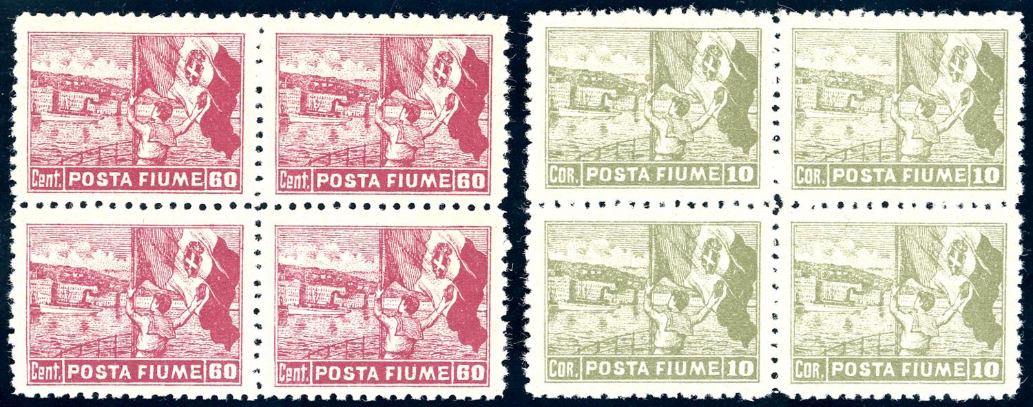 1919 - 60 cent. e 10 cor. Posta Fiume, dent. 10 1/2 (55/II,56/II), blocchi di 4, gomma originale integra, perfetti. Rari. Cert. Oro Raybaudi.