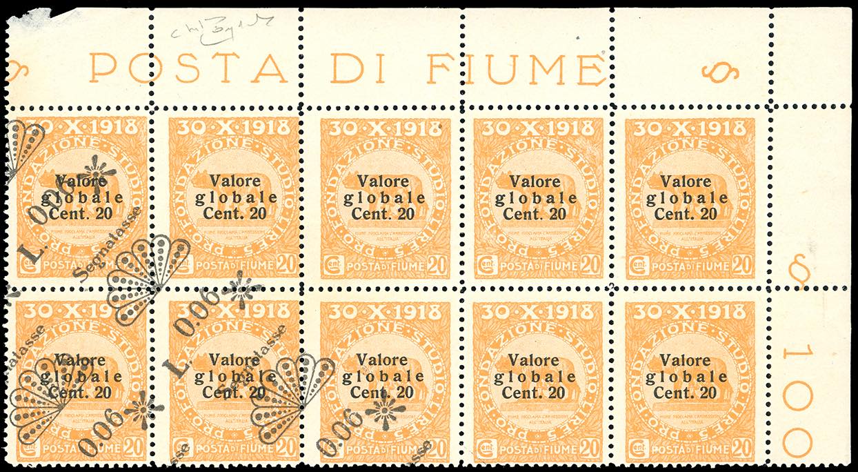 1921 - 0,06 lire su 20 cent. soprastampato (28g), blocco di dieci esemplari, cinque con soprastampa obliqua, perziale o incompleto, cinque ... Read more