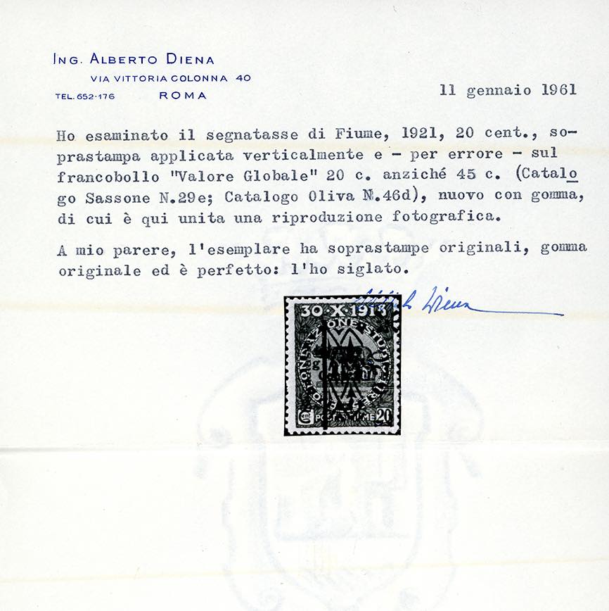 1921 - 0,20 lire su 20 cent. (anziché su 45 cent.), errore di soprastampa (29A), impressa in verticale come sempre, gomma originale, leggera traccia di linguella, perfetto e di ottima qualità. Molto raro. G.Oliva, G.Avanzo, cert. A.Diena.