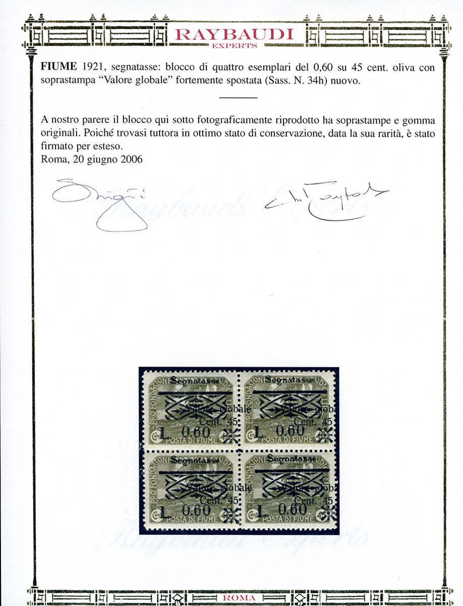 1921 - 0,60 lire su 45 cent. (34), soprastampa "Valore Globale", fortemente spostata a destra, blocco di quattro, gomma originale, perfetto. Rara qualità. G.Oliva, Raybaudi.