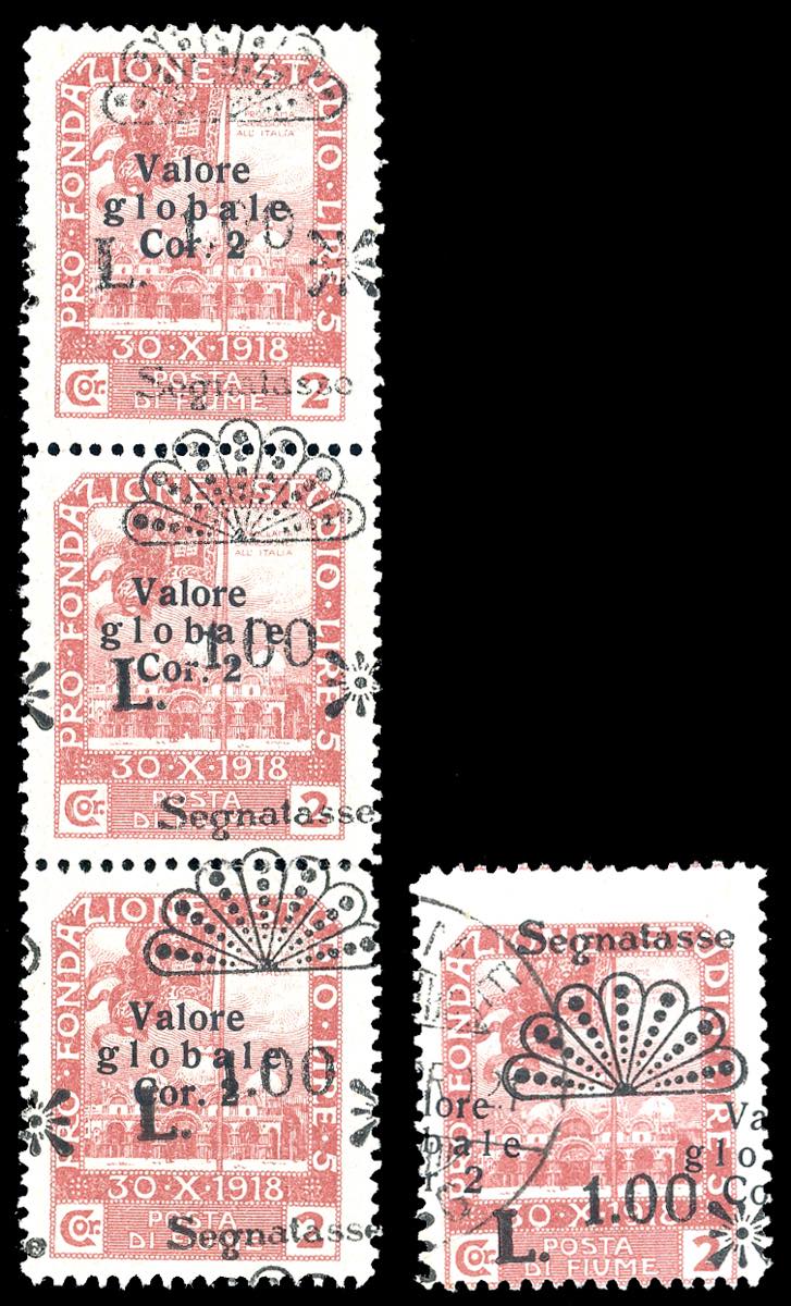 1921 - 1,00 lira su 2 cor. soprastampato, striscia verticale di tre con soprastampa obliqua fortemente spostata in alto e a destra, "Segnatasse" in basso, gomma originale integra, e un esemplare con soprastampa "Valore Globale" fortemente spostata, usato (35nba,35 var.), perfetti. La seconda varietà è inedita.