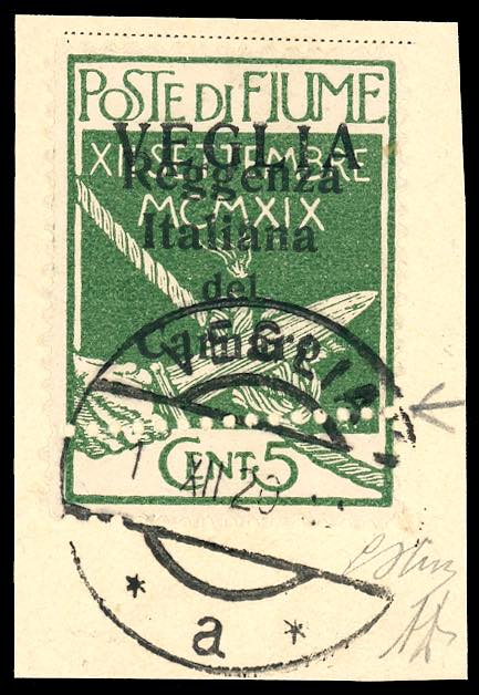 1920 - 5 cent. soprastampato in caratteri grandi, soprastampa "VEGLIA" fortemente spostata in basso e doppia dentellatura inferiore (1cb), perfetto, usato su frammneto. G.Oliva, A.Diena.