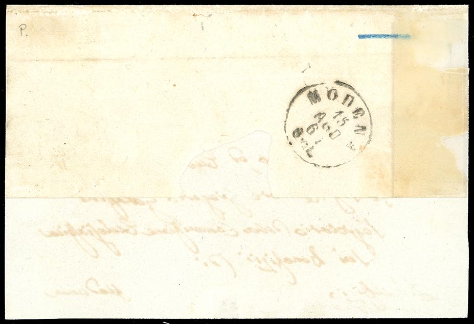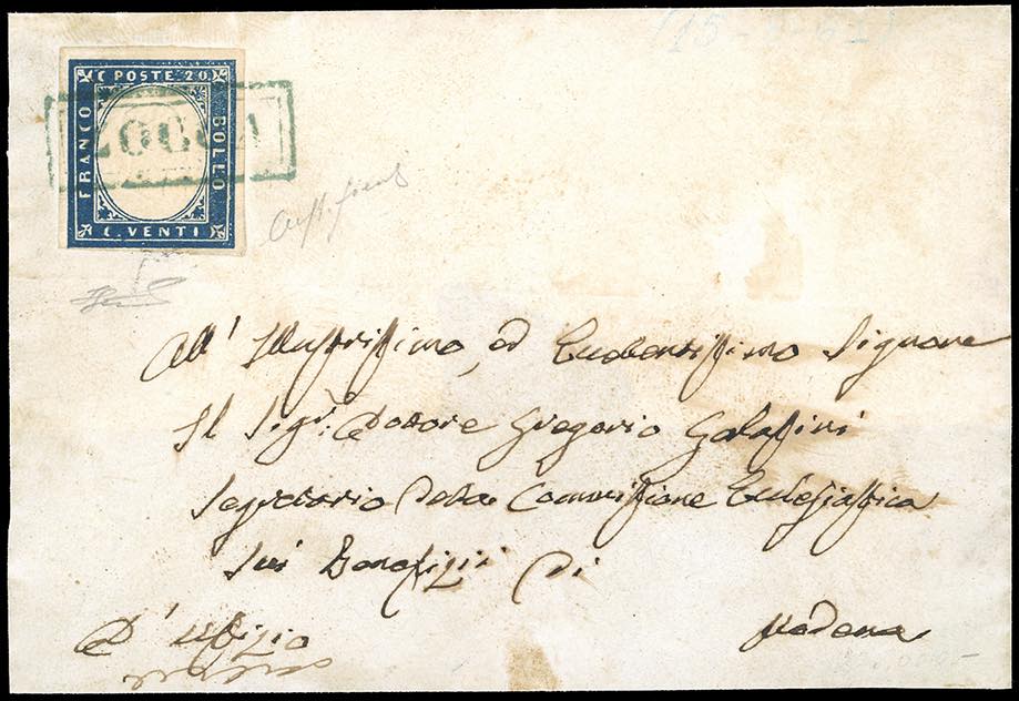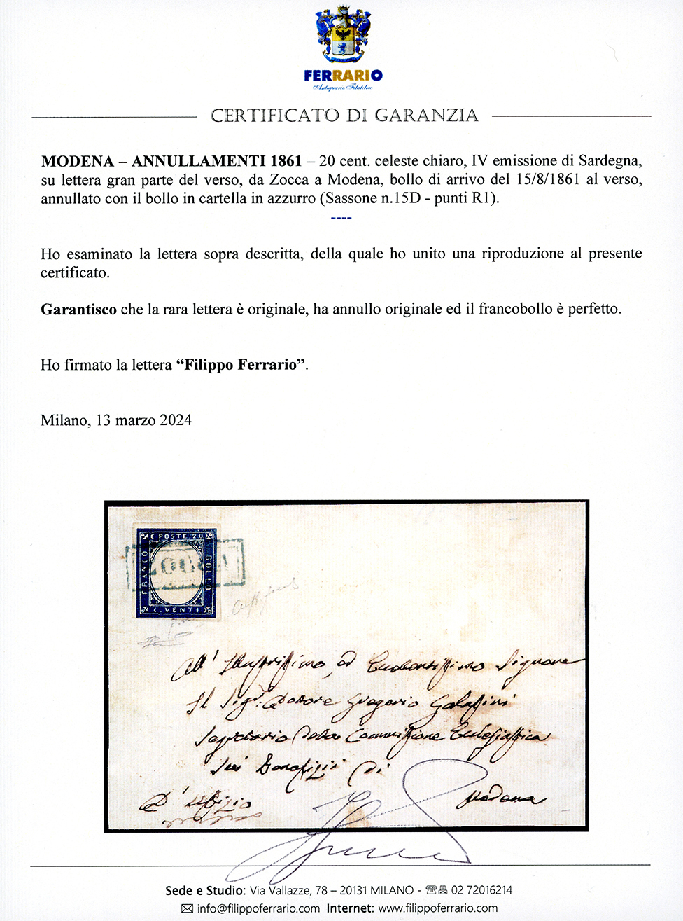 ZOCCA, cartella azzurra punti R1 - 20 cent. IV emissione di Sardegna (15D), perfetto, su lettera con solo parte del verso, per Modena, bollo di arrivo del 15/8/1861. Raro. Fiecchi, cert. Ferrario.